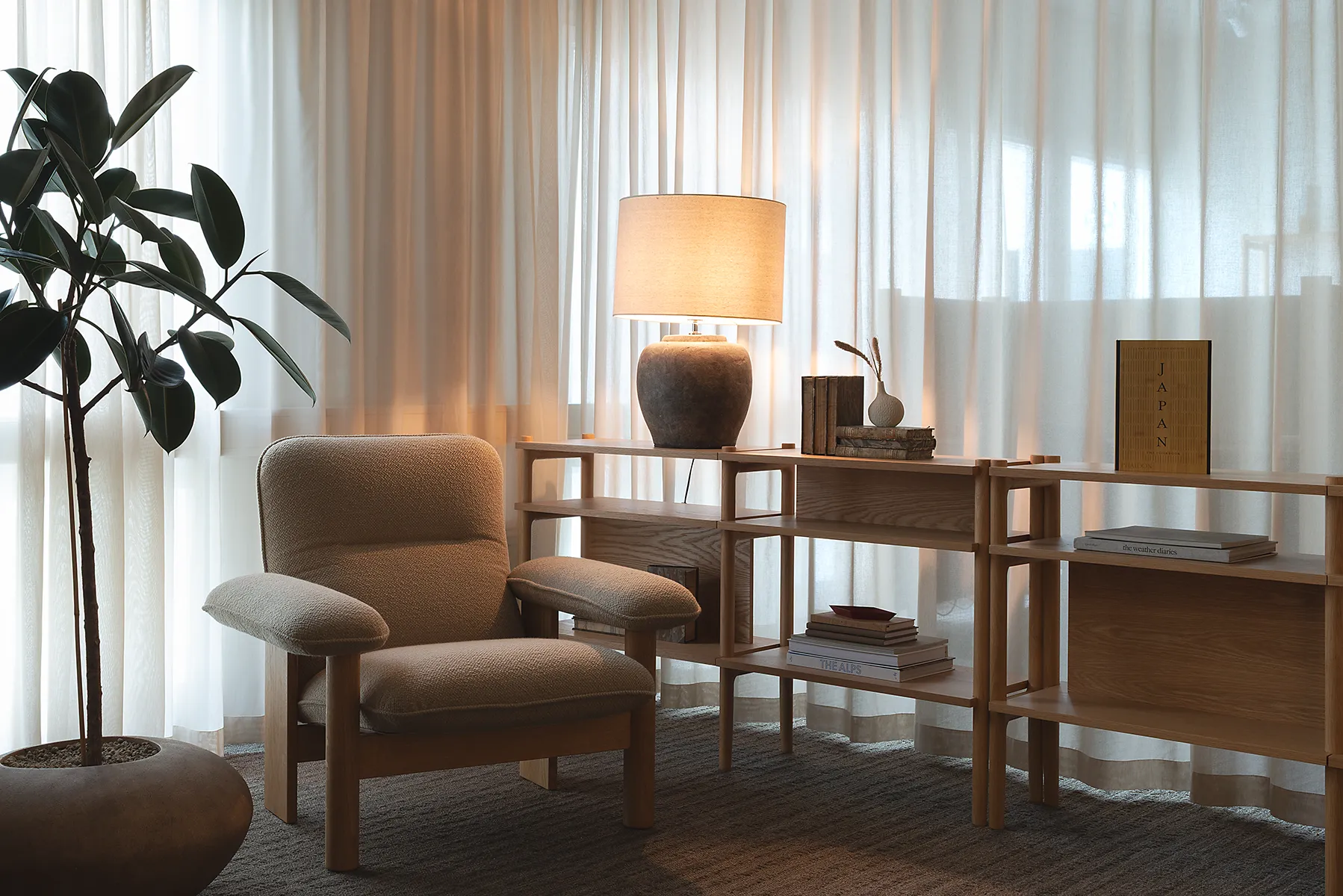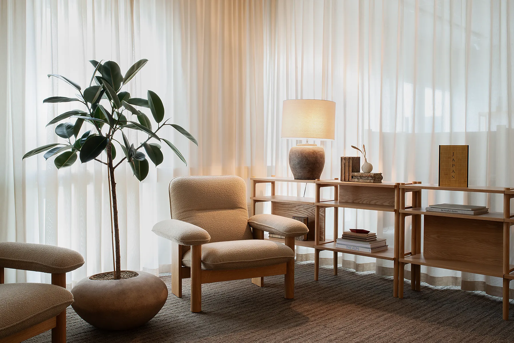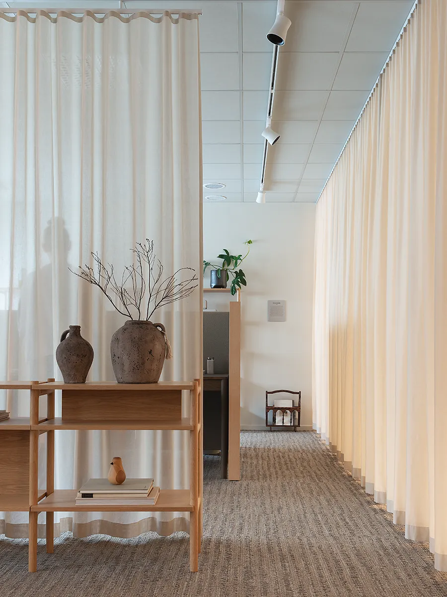 En omvandling av ett befintligt kontor till en modern arbetsmiljö som speglar företagets identitet. Japanska influenser balanseras med skandinavisk enkelhet för att skapa en lugn, funktionell och elegant miljö. Vi levererade gardintyger som syddes till skräddarsydda gardiner som skapar avskildhet och mjuka avgränsningar i det öppna kontorslandskapet.