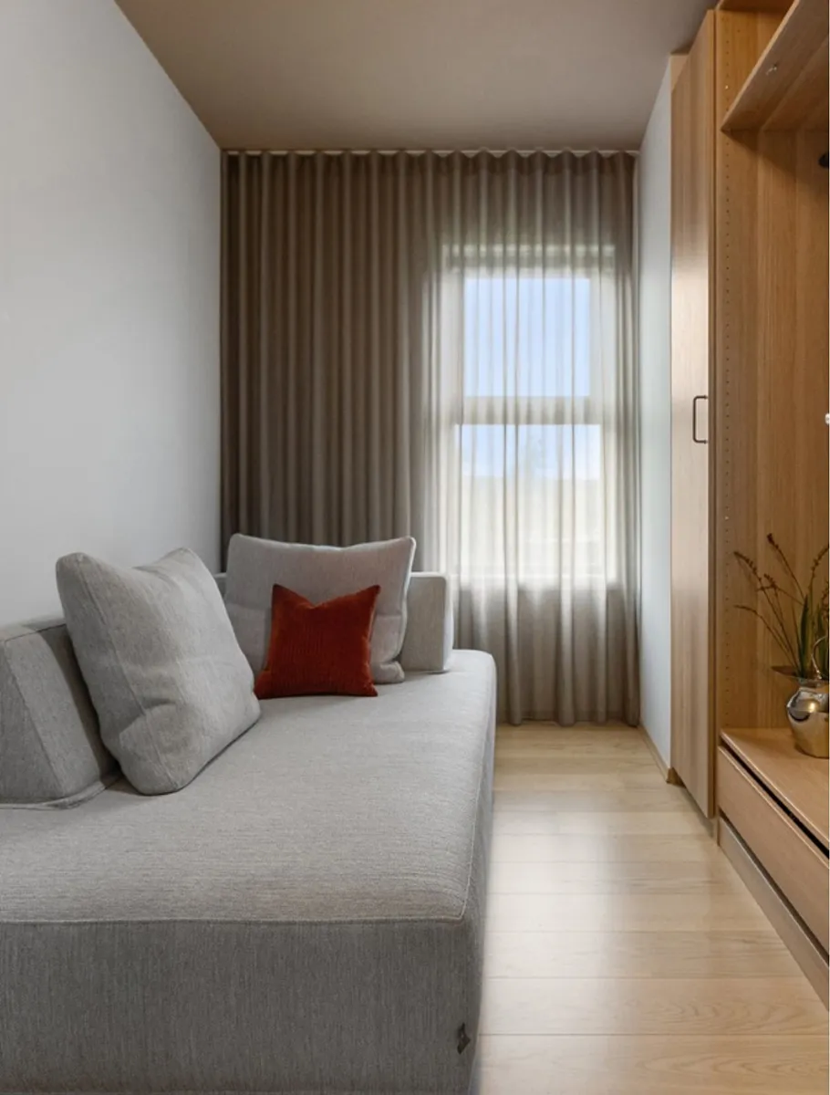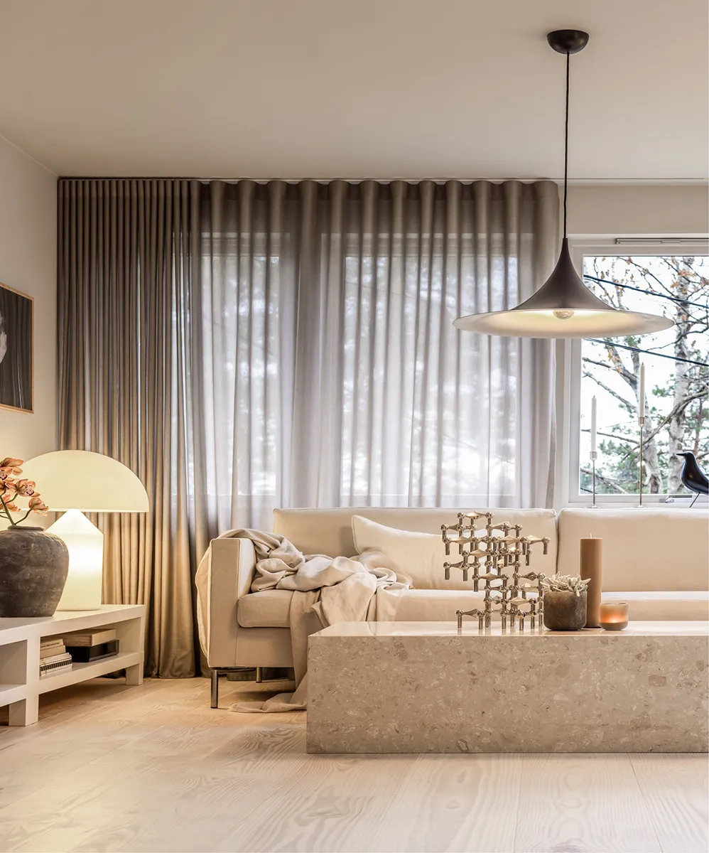 Ett omsorgsfullt genomtänkt bostadsprojekt där balans och flöde präglar inredningen. Vi levererade gardintyger som syddes till skräddarsydda gardiner som mjukar upp övergångarna mellan rummen och bidrar till en harmonisk och rofylld atmosfär.