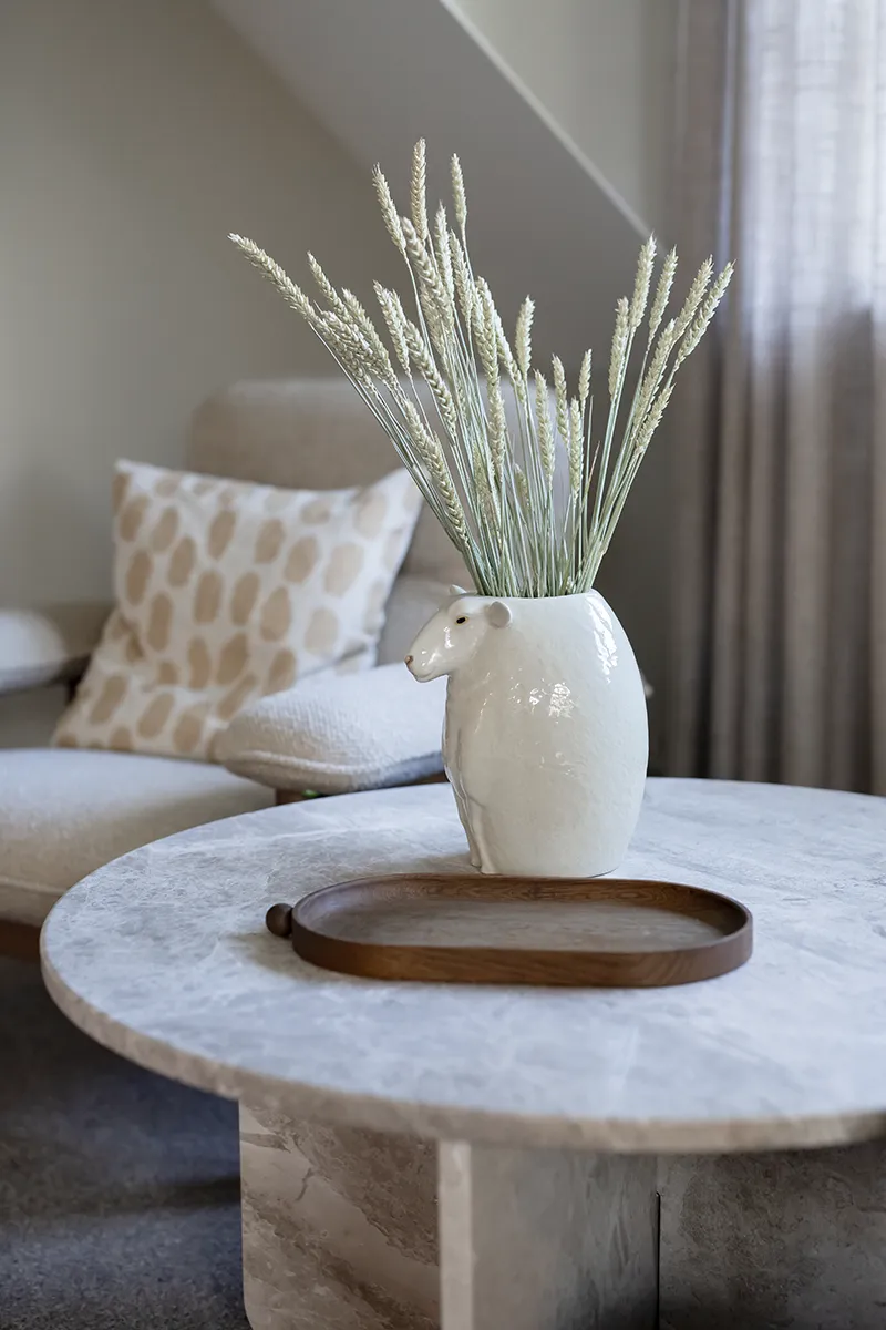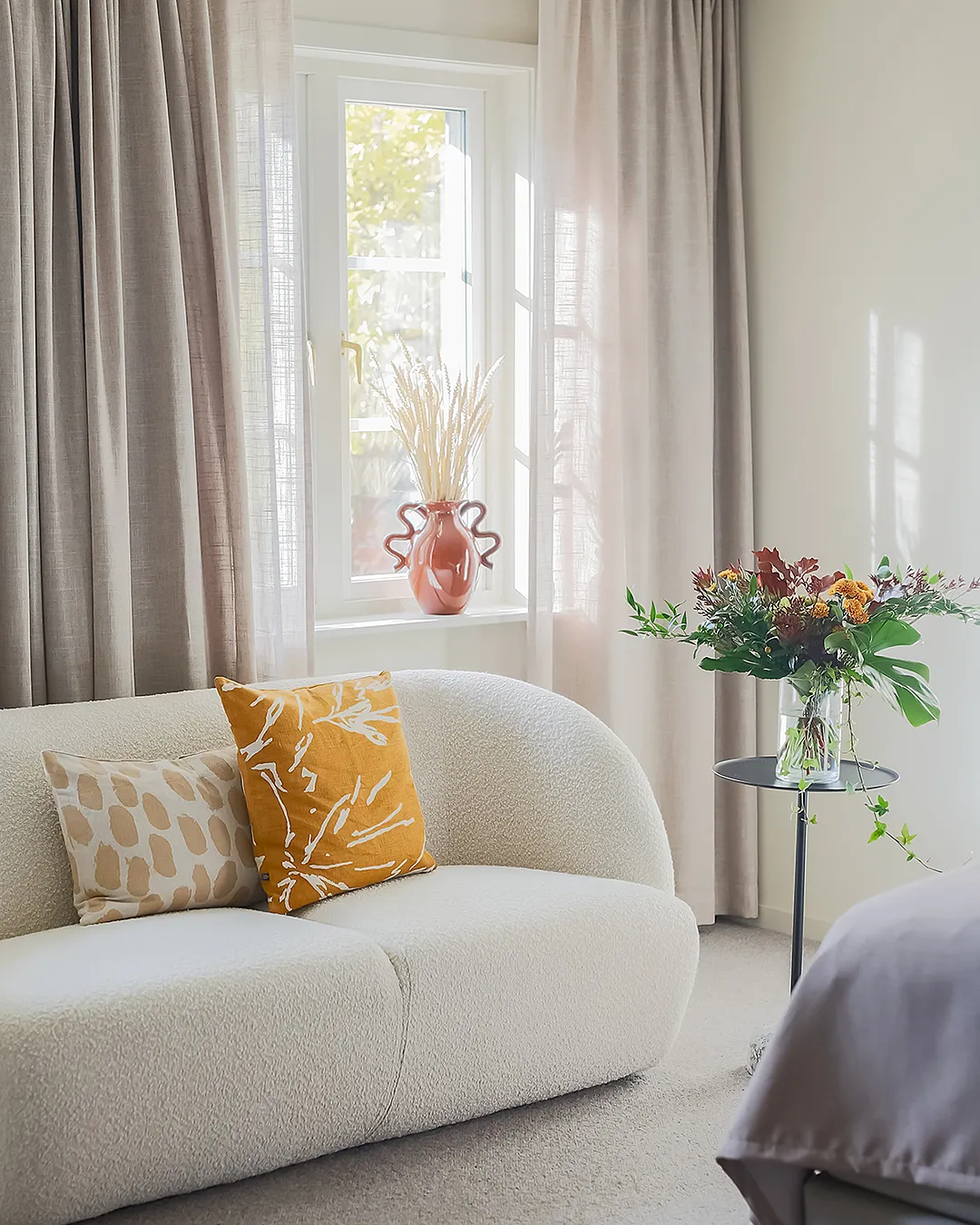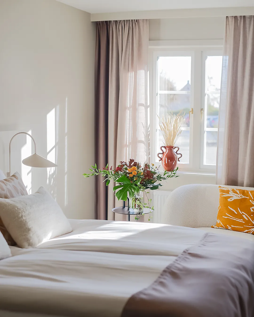 En varm och modern inredning som bevarar hotellets karaktär samtidigt som den ger en ljusare helhetskänsla. Gardintyger från Almedahls sytts till skräddarsydda gardiner som ramar in fönstren och dämpar dagsljuset i rummen.