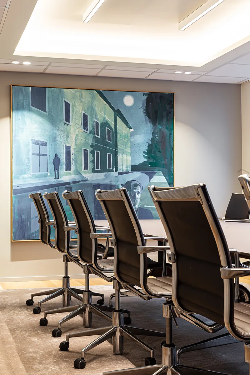 En lugn och representativ arbetsmiljö för Selmer i Oslo, där materialvalen bidrar till en strukturerad planlösning. Vi har levererat specialtillverkade mattor som avgränsar mötesutrymmen och bidrar till en harmonisk arbetsmiljö.